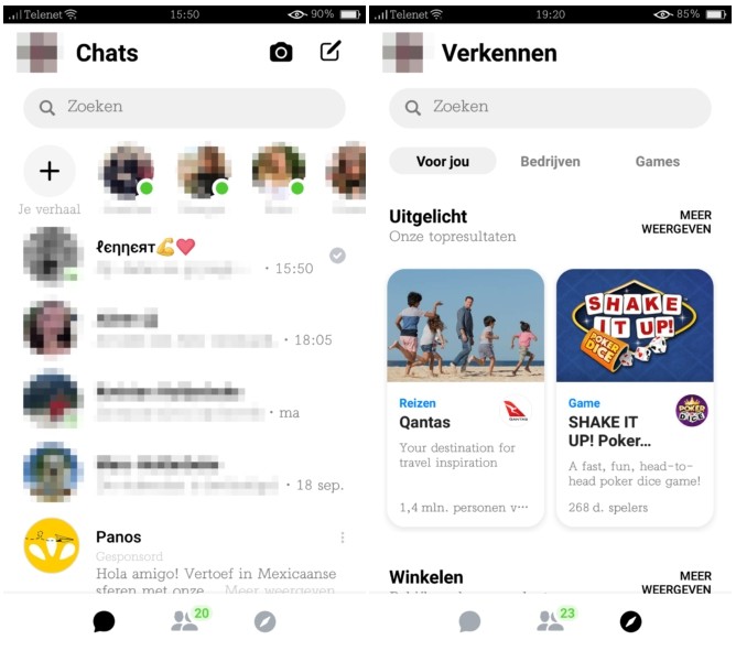 Os prints mostram todas as grandes diferenças da nova versão contra a antiga (que a grande maioria ainda está utilizando): a tela inicial de chat está menos poluída e mais direta, a barra inferior agora conta com apenas três ícones contra os cinco de antes, que incluem o Chat, Contatos e Explorar, onde os usuários poderão descobrir jogos, eventos e outras dicas personalizadas.