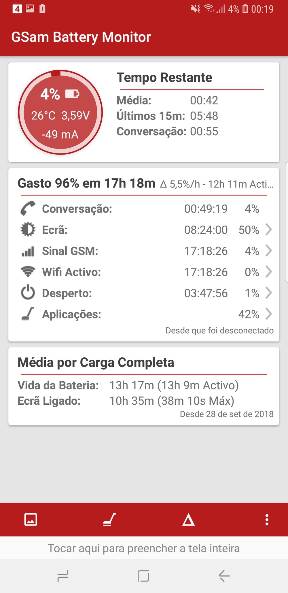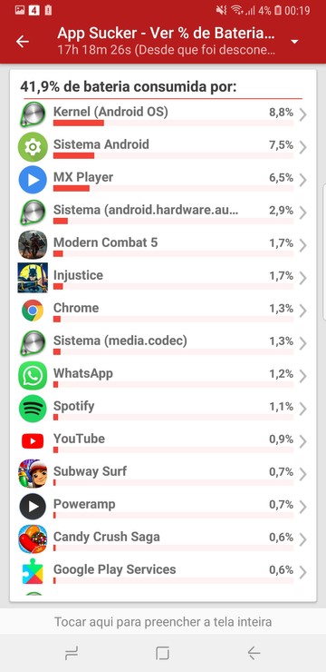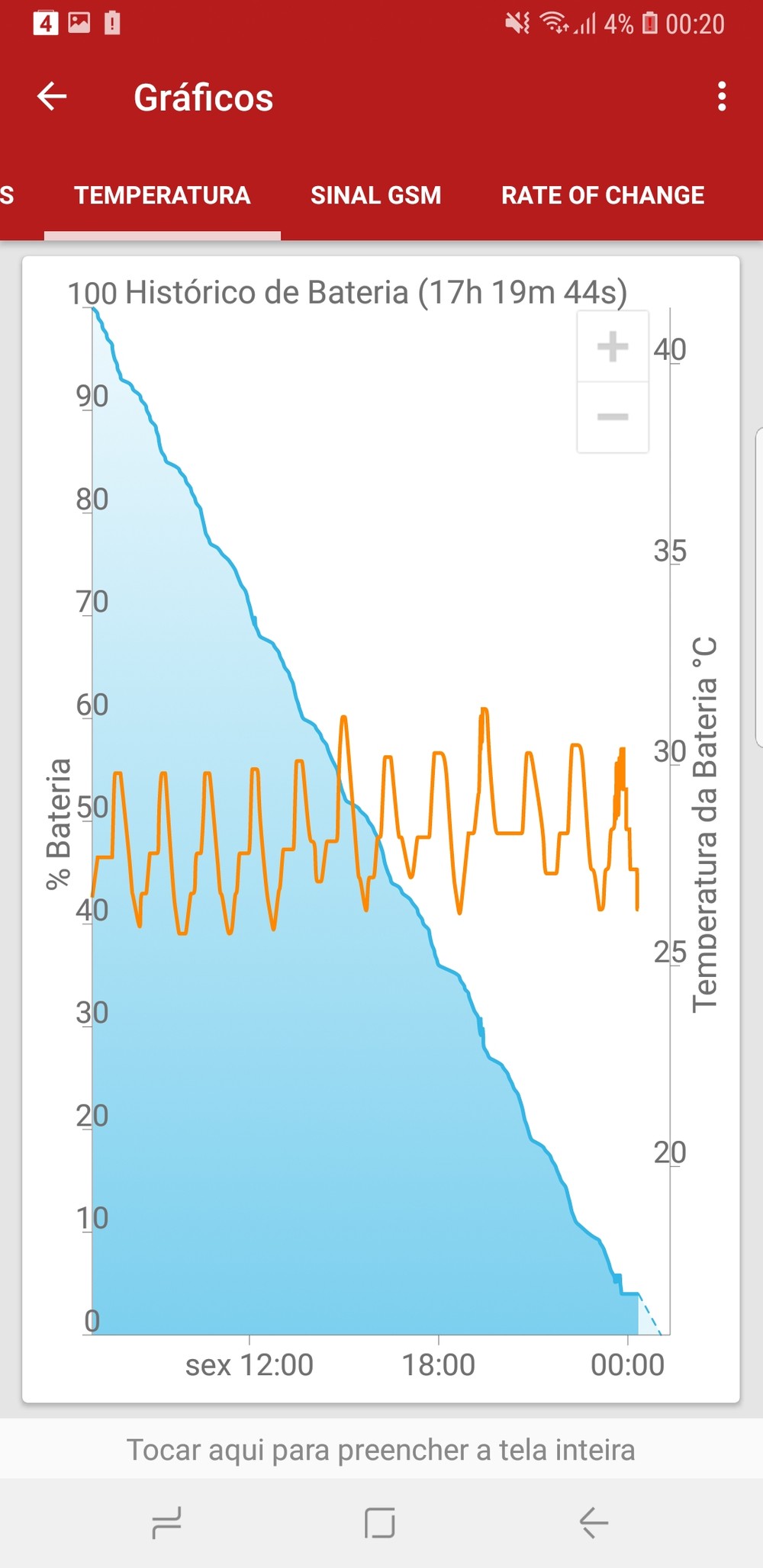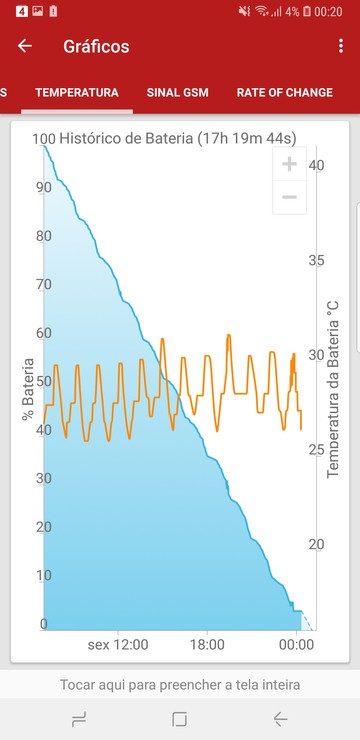 - Foram necessárias 17 horas e 18 minutos para esgotar a bateria do dispositivo, que ainda ficou com 4% de carga ao final.